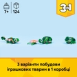 Надихайте на творчу гру з конструктором LEGO Creator Черепаха з квіткою водяної лілії! Набір містить: 3 варіанти складання фігурок тваринаксесуари.Черепаха і хамелеон мають рухомі частини, а жаба може відкривати рот. З додатком LEGO Builder вони можуть конструювати кожен набір більш упевнено: масштабувати, обертати в 3D й відстежувати прогрес за допомогою простих цифрових інструкцій. Основні характеристики Артикул 31377Тематика Тварини, ПриродаОсобливість 3 в 1Кількість деталей 124Тип товару КонструкториСерія CreatorКраїна-виробник Угорщина Габарити Розмір пакунку 5 x 16 x 14 смВага 176 гРозмір іграшки 4 см Рекомендації Вік 7 - 12 роківСтать Для хлопчиків, Для дівчаток
