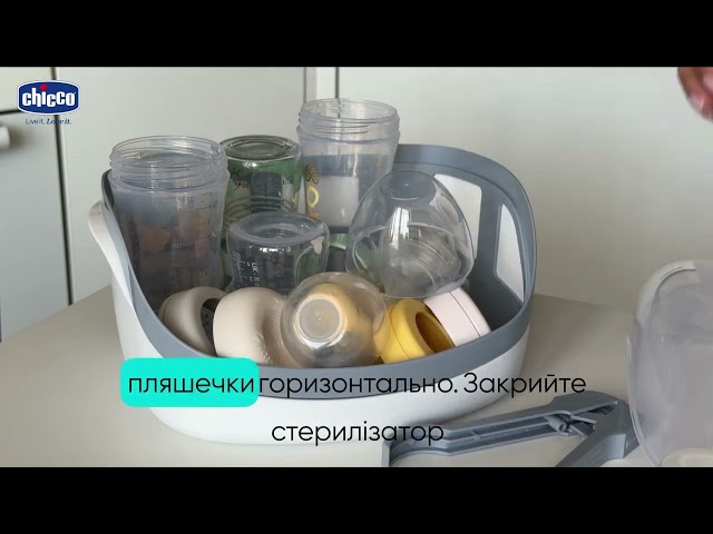 Вмісткий У стерилізатор вміщується до 5 пляшечок Chicco з відповідним приладдям (кільцями, сосками й кришечками).
